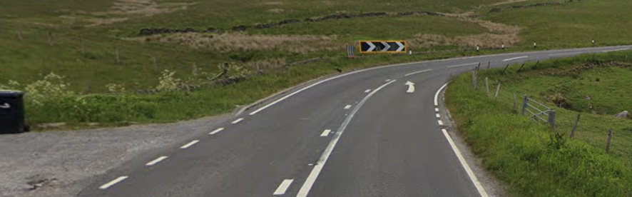 Heading east, under a mile from the above photo, is a corner that has, in recent years, had a fatality and a number of collisions. This is a fast, long right bend. While it’s relatively open and you can see into and around the open corner, there is a stone wall on the offside – again, lethal for bikers. On the nearside, there is a small drop from the road. Due to its open nature, it can cause drivers and bikers to become too overconfident. Note the skid marks in the photo.